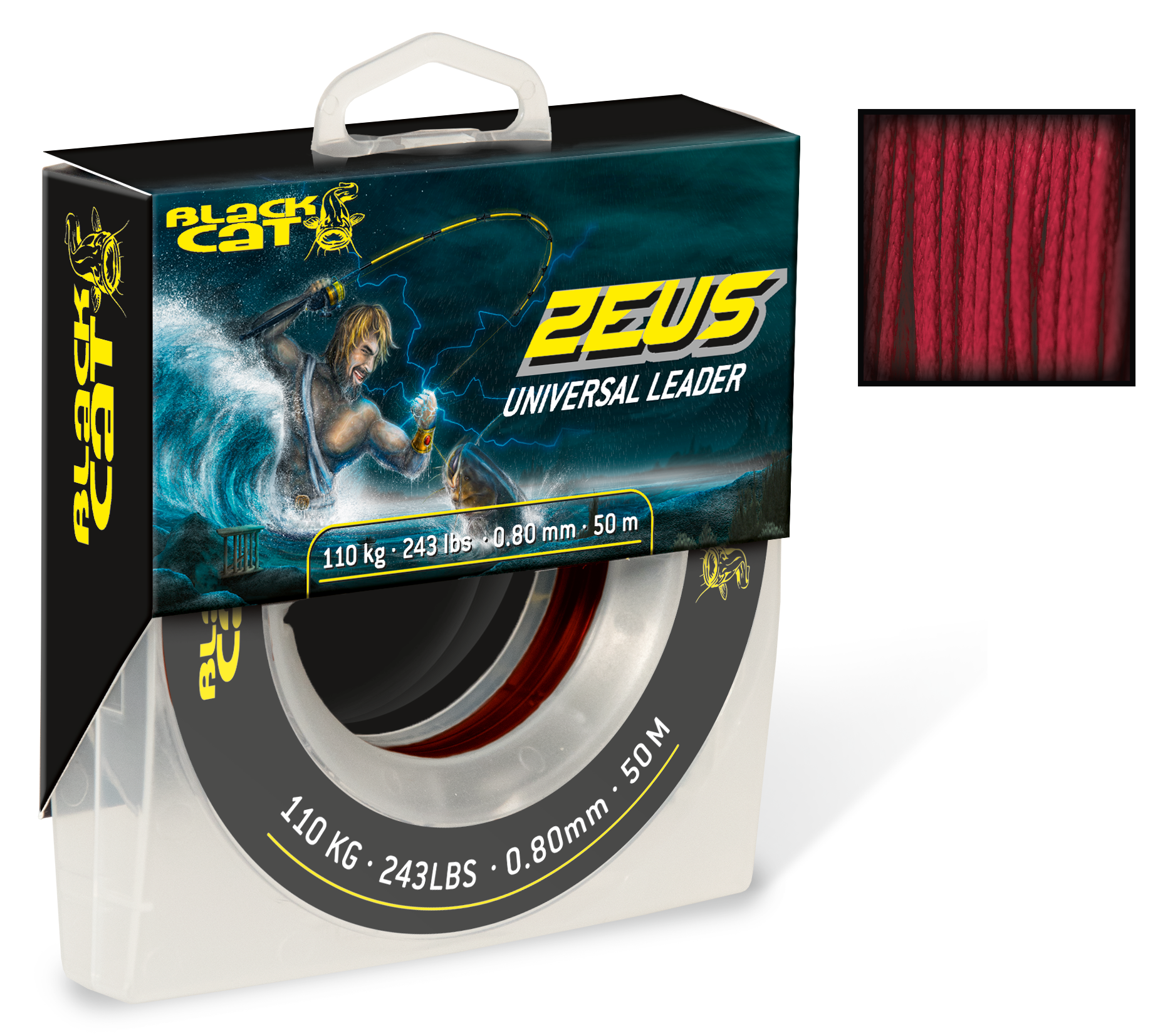 Téměř nezničitelná návazcová šňůra Zeus Universal Leader nabízí příznivcům lovu sumců mnohostranné možnosti využití. 16krát splétaná dutá šňůra se perfektně hodí k zaplétání a má skutečně enormní oděrovou odolnost proti kartáčům velkých sumců a špičatým kamenům na dně. Speciální velmi těsné splétání dělá ze Zeus Universal Leader na jednu stranu perfektní návazcový materiál a na stranu druhou i nekompromisní šokovou šňůru, která ochrání montáž před mušlemi s ostrými hranami, kameny a jinými podvodními překážkami. Sumcař si tedy vystačí pouze s jednou špulkou v tašce, jež pokryje všechny možné situace u vody. Tenká povrchová teflonová vrstva se stará o snížený odpor vody a nedopustí její nasáknutí do šňůry. Červené zbarvení je při freestyle rybaření s vyvazováním a odbočováním šňůry nad hladinou pro rybáře velmi dobře viditelné. Velká cívka s návinem 50 metrů (2353080) / 40 metrů (2353110) garantuje naplnění tří navijáků s návinem šokové šňůry a navíc ještě návazcový materiál na až sedm sumcových montáží. Stefan Seuß říká: „Ještě nikdy jsem nelovil s tak spolehlivou šňůrou v oblastech přední linie!“